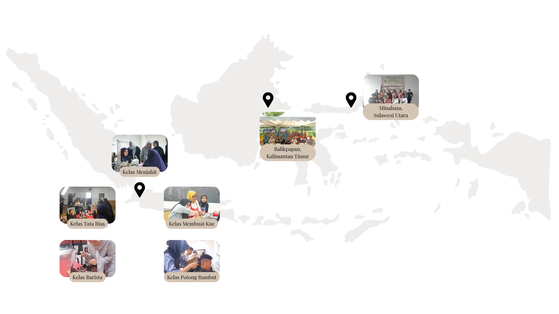 Dari ibu kota hingga ujung utara Sulawesi. Pada tahun 2025, jangkauan pemberdayaan kami meluas dan menjadi lebih inklusif di berbagai wilayah. Di DKI Jakarta, perempuan dan kaum muda berlatih bersama di ruang belajar kami, Rumah Rangkai Karsa. Masyarakat lokal di Balikpapan dan Minahasa juga diberdayakan melalui pelatihan daur ulang, mengubah sampah di sekitar mereka menjadi produk-produk kerajinan lokal yang indah.